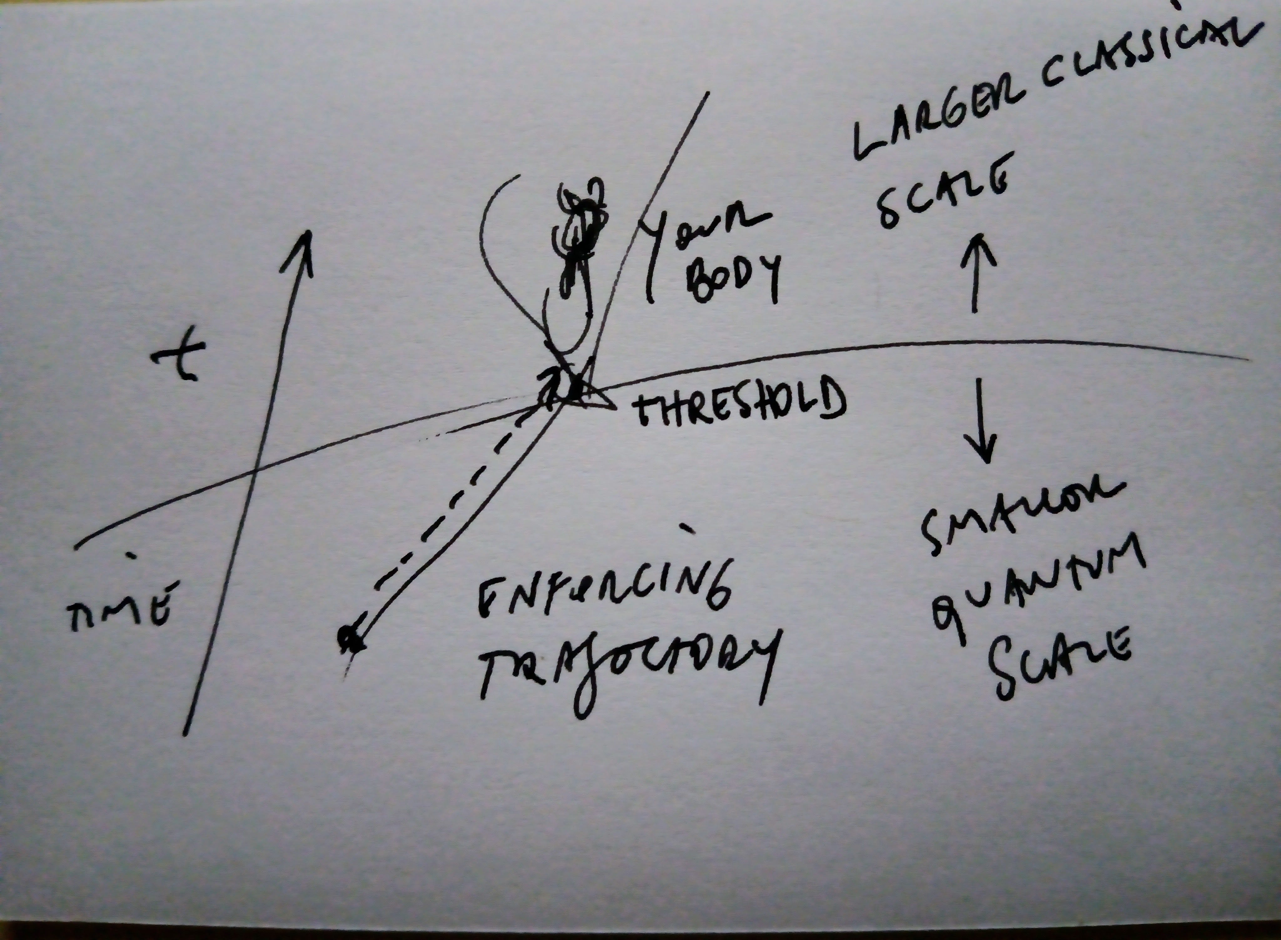 [Matter]+[Movement]=[Existence]⇒[Intent]⇔[Mind] In exactly the same way that the physical reality of your existence — the infinitesimal foundational matter of what you are giving you right now the ability to have the notion of knowing that you exist and, at the same time, sustaining the physicality of your body through the physical impulsing motions it does into your cells, constantly, supporting them as a physical constituency that does not disintegrate, keeping them whole — precedes the need of having a body, in the sense that it (your existence, as described above) precedes the formation of the body itself, only moments later “joining” (in the sense, that there is a movement being made, from one location that is smaller in scale to another that is larger) and integrating itself into and with it, your mind, which comes compounded within it all (the result or effect of that specific movement, in the sense that it does its own kind of movement, as opposed to the kind of movement mine does), precedes it too; it (your mind) exists before the body, right there in that threshold — with, in between, and then into — and with your body, all the way through and throughout that enforcing trajectory. (Phew! Now brace for hand-drawn-picture directives below.)
